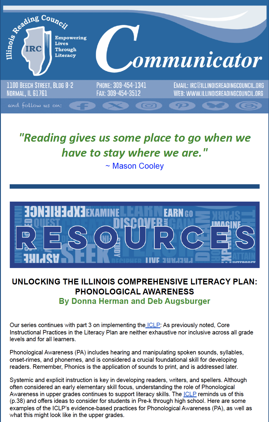 - Unlocking the Illinois Comprehensive Literacy Plan: One Council's Journey by Donna Herman and Deb Augsburger